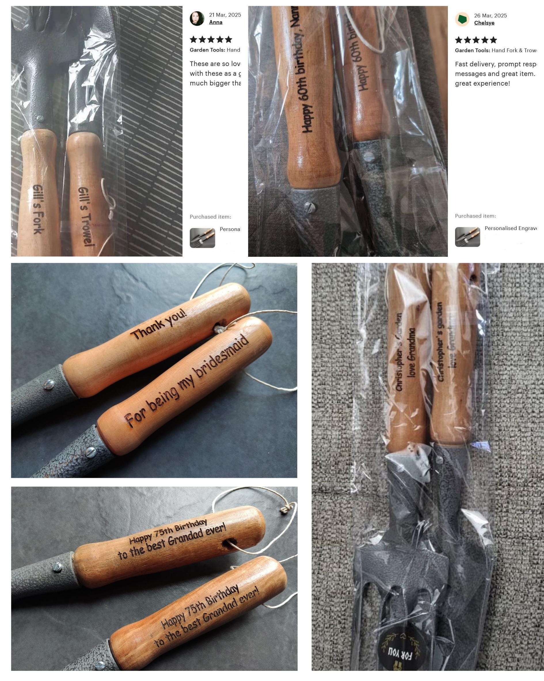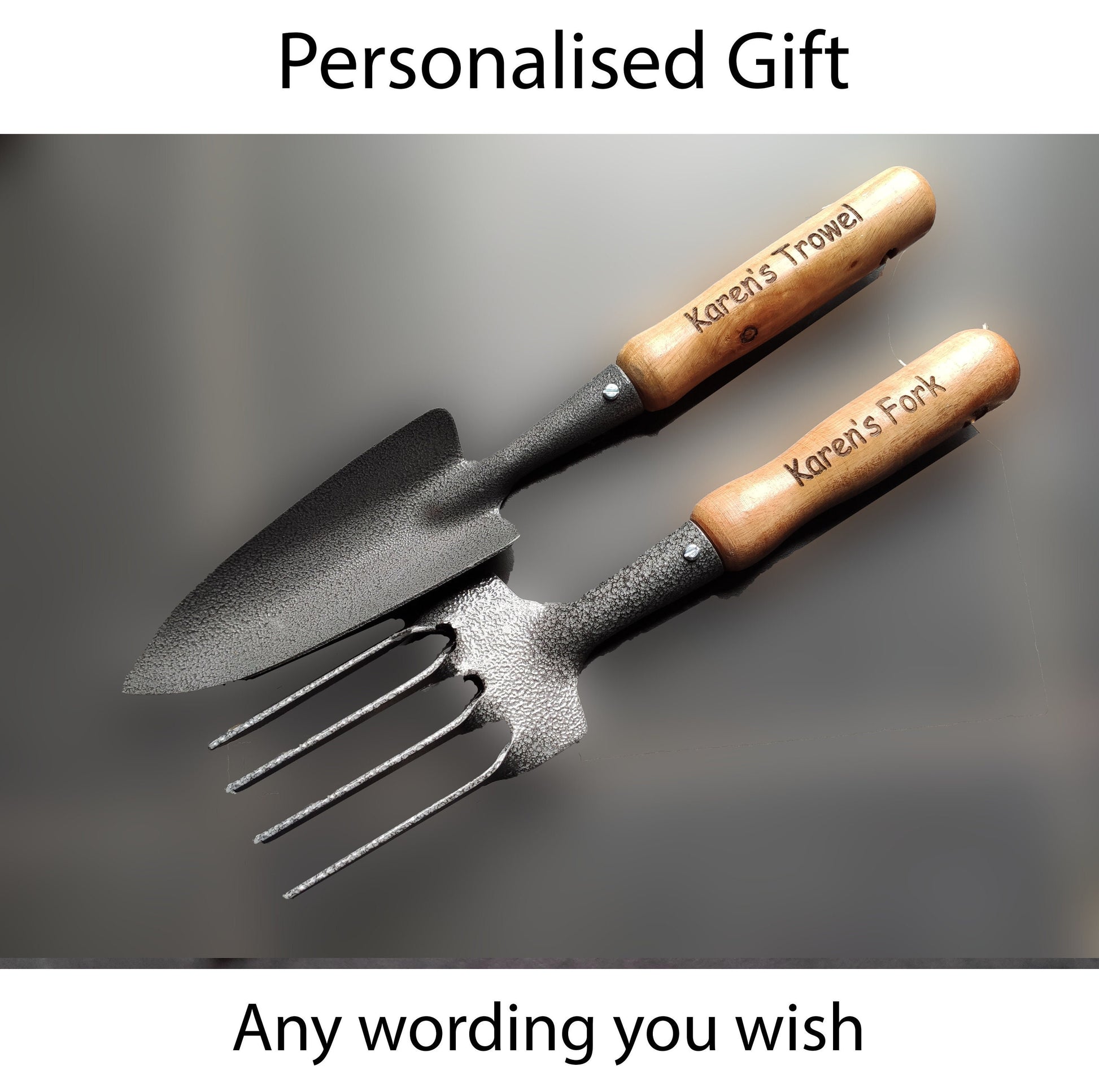 Personalised Engraved Home Gardening Tools Set Gift Retirement Fork Shovel Spade Custom Present Thank you Wooden Steel